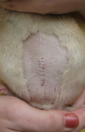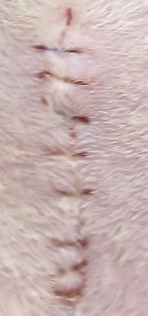 Pictures at 24 hours post op. Her scar is longitudinal and approximately 2.5 cm in length. The sutures are dissolvable. She has had daily Metacam for pain relief and seems pain fee (willing to move freely, climb etc.)